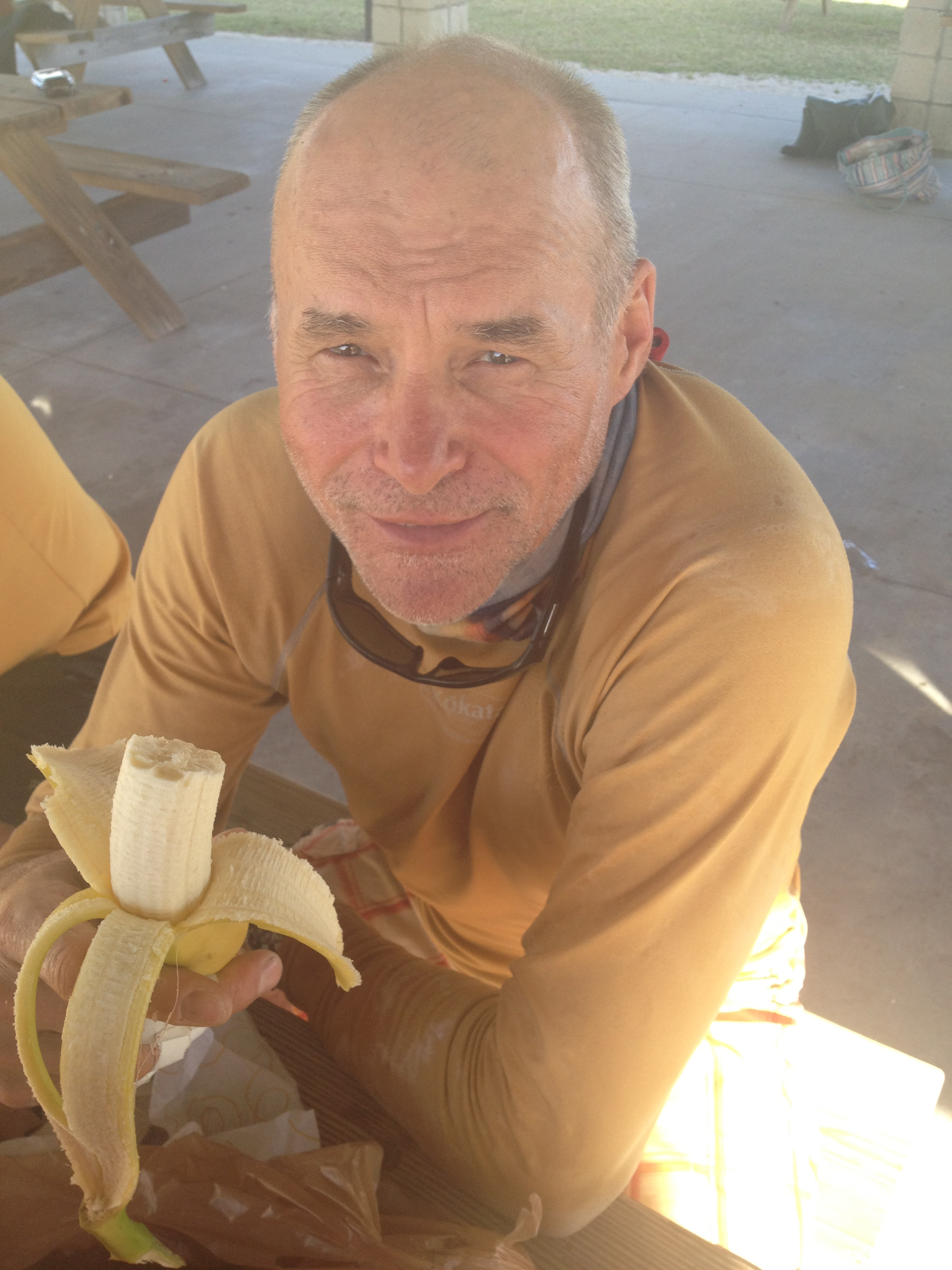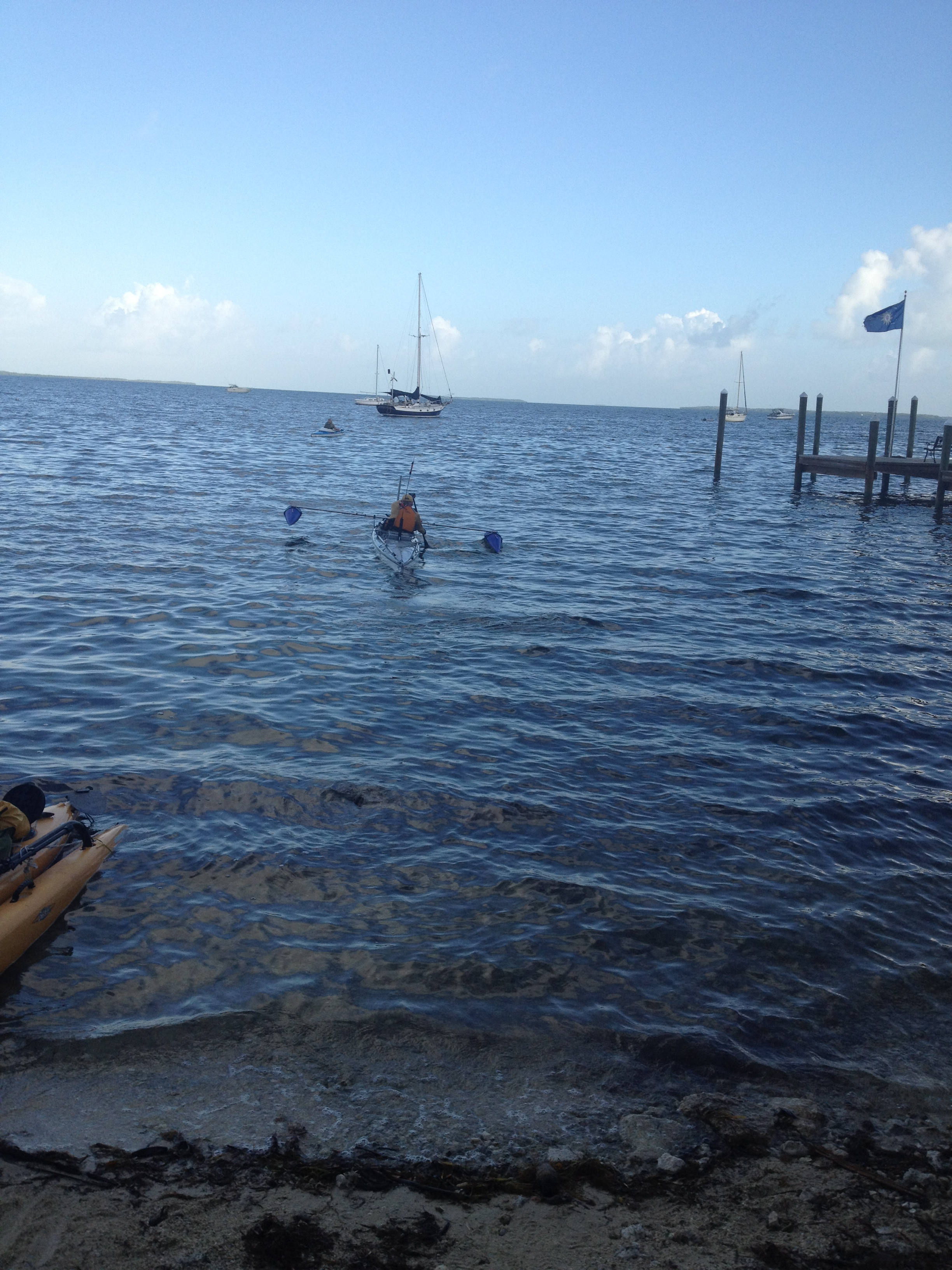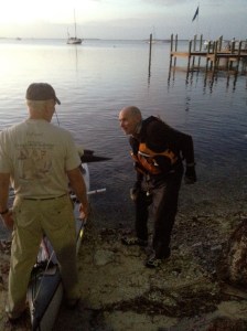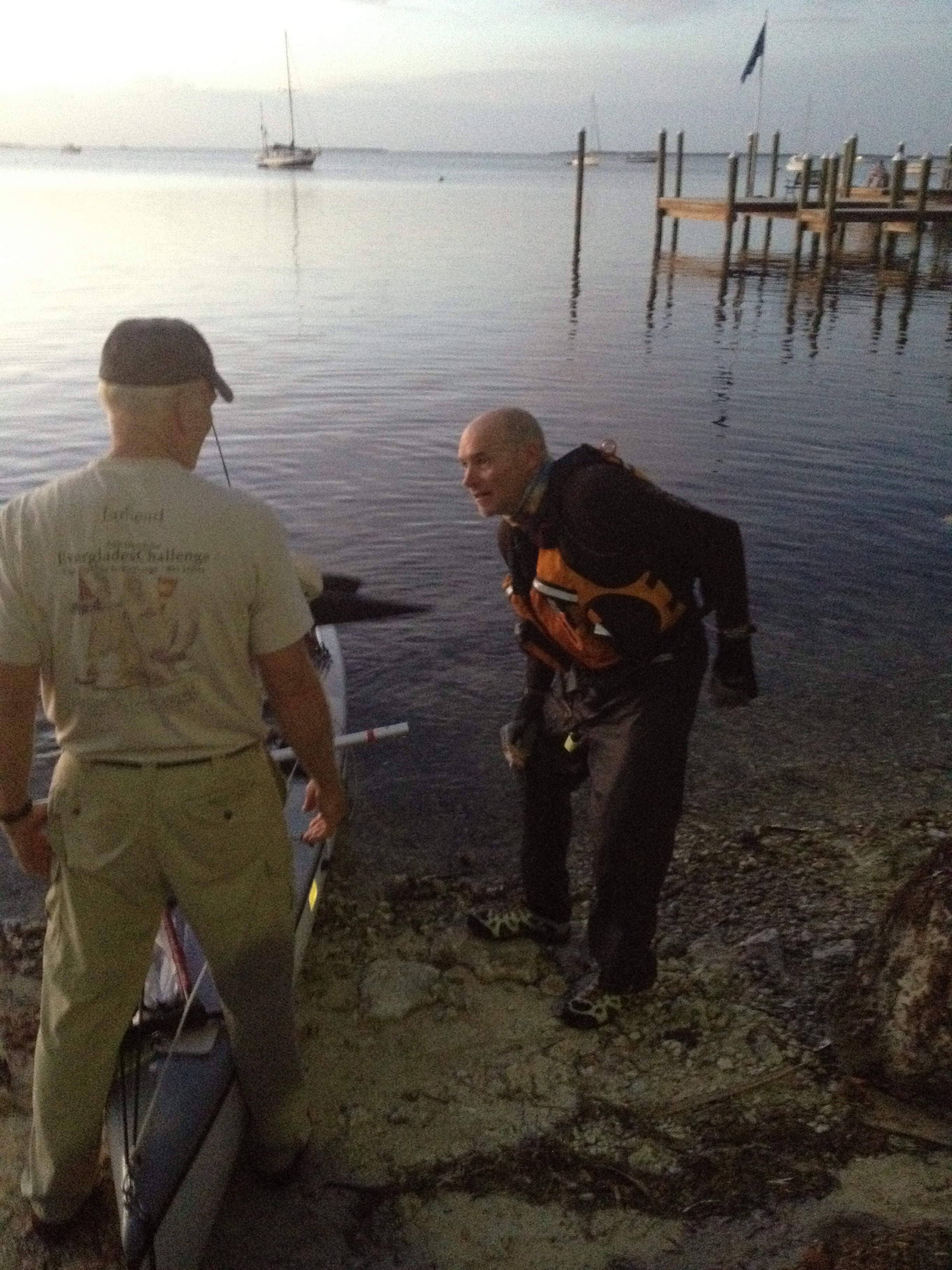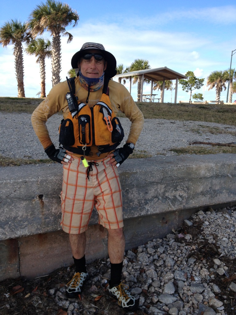 Ok, I think I left off with Bill reaching Checkpoint 3 in Flamingo on Thursday night. He was so tired at Flamingo that he didn’t even pitch his tent. He put his tarp down on the ground next to his boat and slept right there. He left Flamingo for Key Largo at 6:30am Friday morning. It looks so easy on the map, just a mere couple of “inches” east and he’s in Key Largo, right? Paddling into an east wind made for a long day on little sleep but a mere 12 hours later he pulled into Key Largo, the finish line for the Everglades Challenge and now Checkpoint 1 for him. This was the first time I have been able to be there when Bill arrives at a Checkpoint or finishes a race so I was ecstatic to have made it there in time to see it. The picture I will post is Bill right after he got out of the kayak. (It takes him in a minute, or two, or three, to get his “land legs,” so that’s why he is standing like that.) I stood back and watched as his brethren of Watertribers swooped in and took care of him. Helping him walk, taking his boat and anchoring it, handing him a beer, etc. When he finally made it to me I was on a roller coaster ride of emotions… I was so happy to see him, but I didn’t want to touch him and was wishing I was downwind from him. So maybe it is not such a bad thing to not get there when he arrives but maybe after he gets a shower? I got a big kiss and wished I had had some tequila and lime to go with all the salt!! 🙂 After arriving at the hotel, I was getting a good idea of how he was doing both mentally and physically. Mentally he was great. Physically, I would have liked to have seen less damage. Mostly his hands are really blistered and one nail got smashed. He does wear gloves but he thinks the day he had to hold the sail rigging did a lot of the damage. Our daughter, Caitlin, is an Athletic Trainer, and did that degree ever pay off. She had trained both of us on how to treat his hands should this happen and we were grateful. Other than his hands, a boat wake pushed his kayak into him while he was beaching and it knocked him onto a rock giving him a bad cut/scrape on his knee.